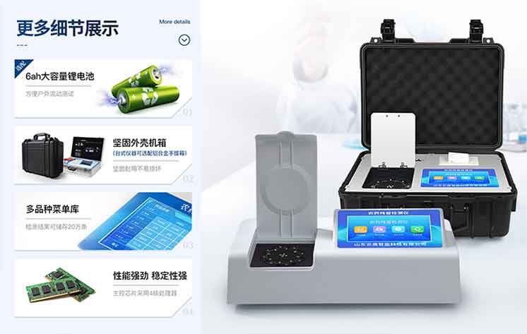 主营业务是研发、生产:农药残留检测仪、兽药残留检测仪、食品安全检测仪等快检设备, 公司与全国各大高等院校和科研院所建立了良好的合作关系,大量引进高等科技成果,研发了众多质量上乘,价格优良的高科技产品。 多年来,公司研发生产了百余种食品检测仪器和相关集成系统方案,产品销往全国各地。公司拥有软件产品设计和开发团队,专注于具有自主核心技术和知识产权的软件产品。