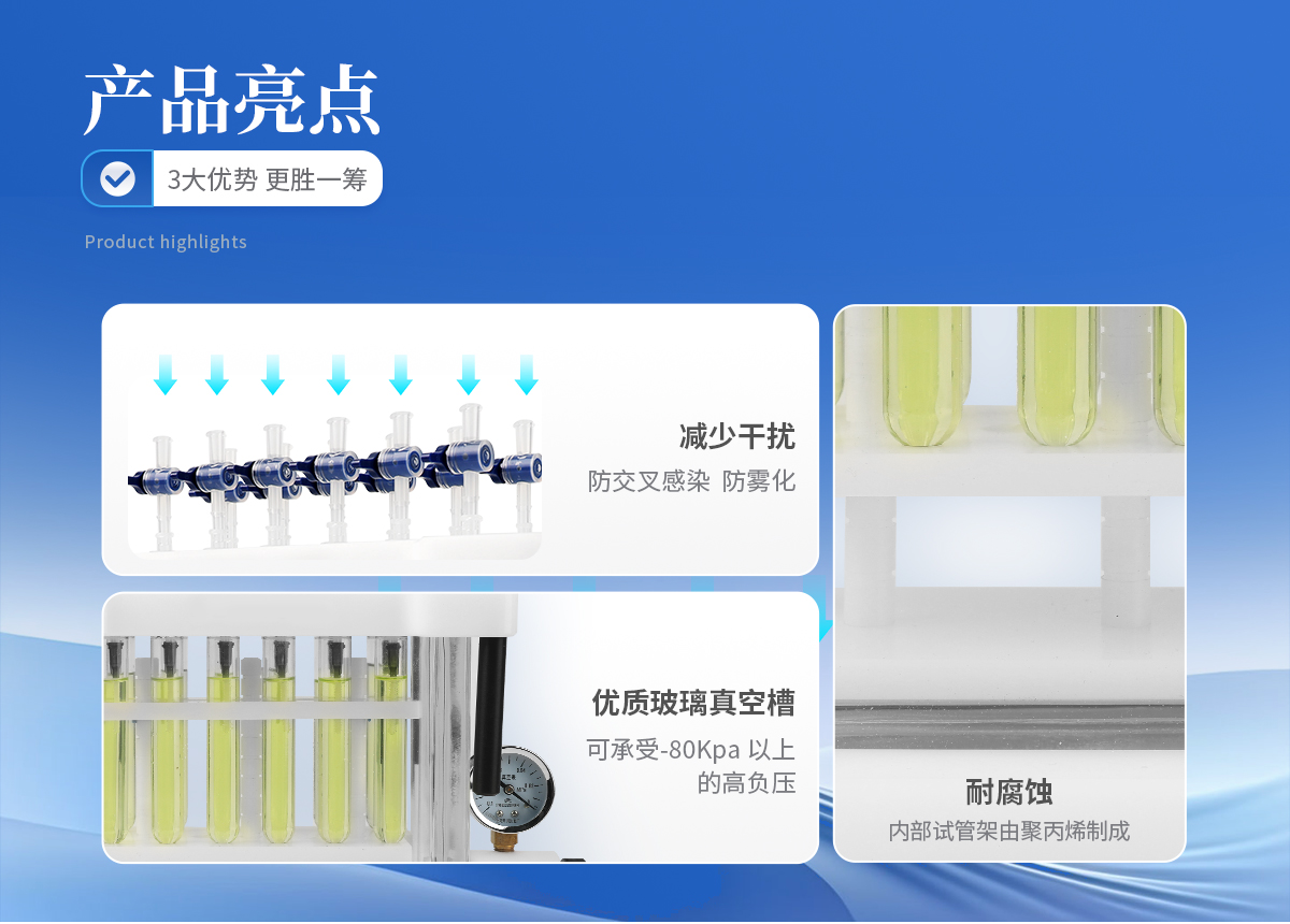 | 可处理样品数:12 位 | 真空玻璃槽尺寸:190*100*170mm | 耐压能力:优于 80Kpa(65Kpa 是我们建议的耐压能力) | 稳定压力范围:0-80Kpa 可调 | 配套试管架尺寸:Ø13/ Ø16,长度 145mm 以下。 |