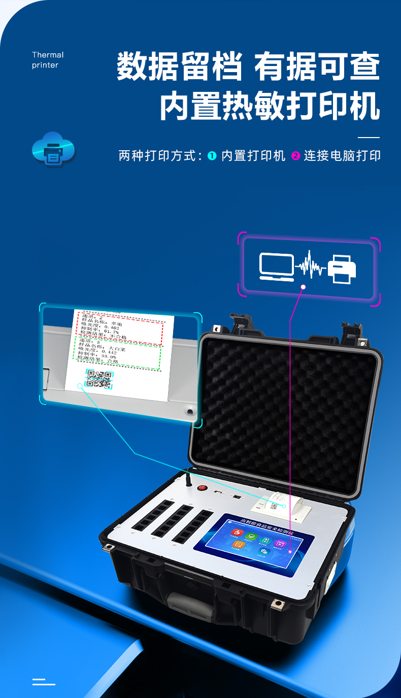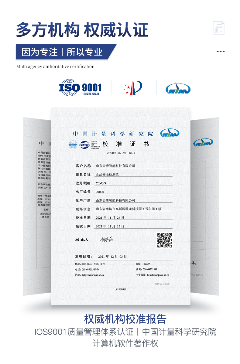 | 安卓智能操作系统,采用更加**的UI交互界面,仪器具有wifi联网上传、4G联网传输、GPRS无线远传、网线连接功能,快速批量上传数据。 | 智能化程度高,仪器具有自检功能:具有开机自检和调零功能,具有自动检测重复性功能。 | 新一代高速热敏打印机,检测完成可自动打印或批量打印检测报告和二维码。 | 仪器带有监管平台,数据可局域网和互联网数据上传,检测结果直接传至食品安全监管平台。进行区域食品安全监管及大数据分析处理与数据统计,检测区域食品安全长短期动态,达到食品安全问题预估、预警 | 一体化主机,包含食品安全检测模块、多通道农药残留检测模块、胶体金免疫层析检测模块。 | 一体化便携式快检设备,满足现场及流动检测使用需求,能够在同一软件下实现所有检测项目的检测,并可通过同一窗口直观显示检测结果。 | 胶体金模块检测方式:轨道式自动传输扫描,检测完成后自动退出检测卡。 | 食品安全检测仪CT线自动识别,无需手动调整,检测完成自动显示CT坐标曲线。 | 内置强大的数据库,具有多品类多种类样品菜单功能,可灵活选择检测样品,不同的检测通道可同时检测不同的样品项目。也可在仪器上直接编辑录入样品名称、检测指标、送检单位等信息并保存进样品数据库。 | 产品内置操作演示视频,是您身边的化验指导专家。 | 样品处理简单省力,整体操作快速、安全、便捷。 | 仪器具有自身保护功能,可设置用户名及密码,防止非工作人员操作等。 | 高灵敏度,高检测精度,高重复性精度,扫描式高精度光学传感器。 | 结果判定线可修改,对照值标定值可保存,断电不丢失数据。 | 兼容市场上所有的胶体金卡,使用耗材不受限制,极大增强用户使用体验。 | 仪器具有重新校准、锁定、恢复出厂设置功能。 |