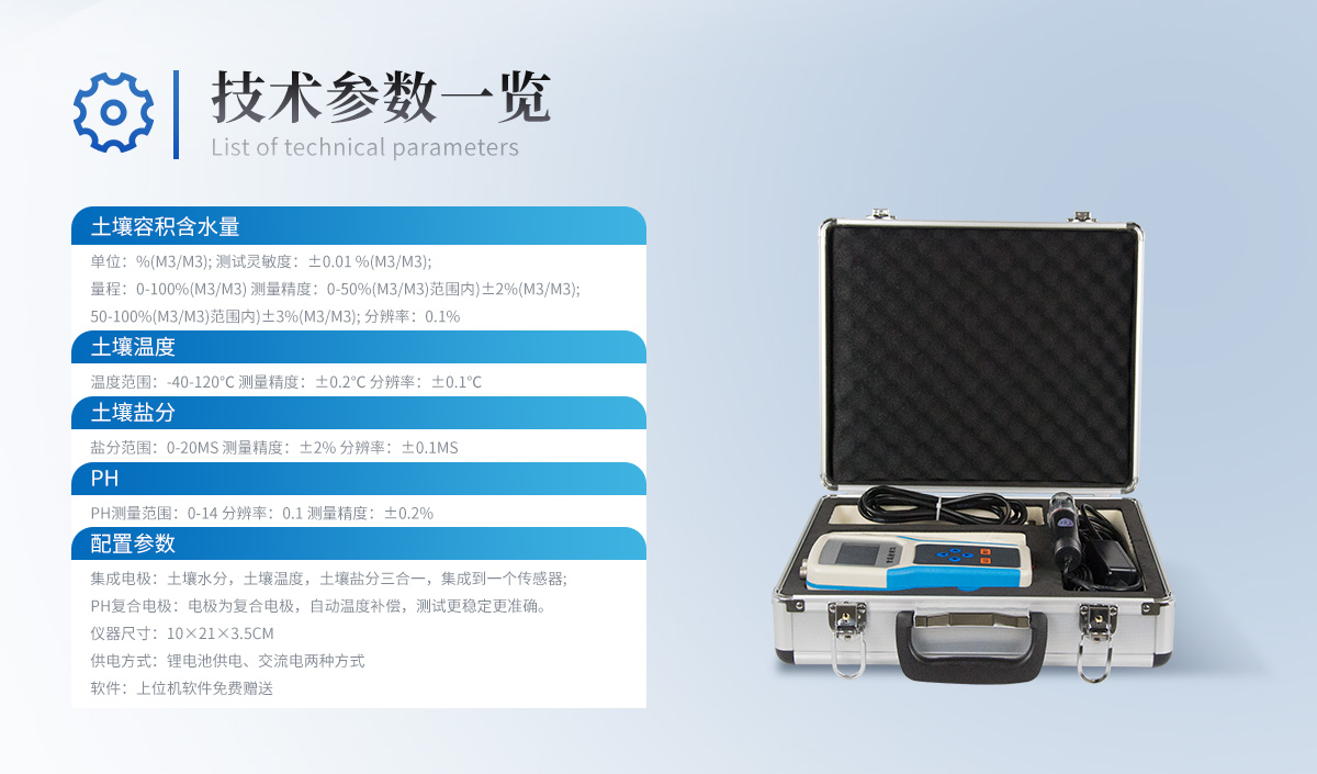 | 土壤水分:(土壤容积含水量:) 单位:%(m3/m3);.测试灵敏度:±0.01 %(m3/m3);.量程:0-100%(m3/m3); 测量精度:0-50%(m3/m3)范围内)±2%(m3/m3);50-100%(m3/m3)范围内)±3%(m3/m3); 分辨率:0.1% 互换精度:<3% 复测误差:<1% 响应时间:<1秒 测量稳定时间:1秒 测量区域:直径为10cm、高为10cm的圆柱体 | 土壤温度: 范围:-40-120℃ 测量精度:±0.2℃ 分辨率:±0.1℃ 互换误差:<0.2℃ 响应时间:<100mS 稳定时间:<1秒 | 土壤盐分: