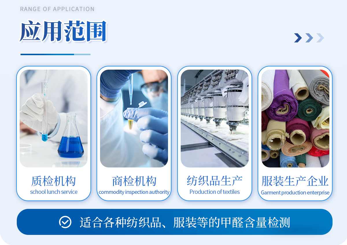 该纺织品甲醛检测设备满足纺织品甲醛含量检测的中国标准《国家纺织产品基本安全技术规范》(GB 18401-2010)、《纺织品.甲醛的测定.第1部分:游离和水解的甲醛(水萃取法)》(GB/T 2912.1-2009), 适合各种纺织品、服装等的甲醛含量检测。