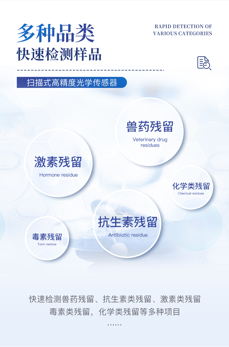 瘦肉精检测仪可现场快速检测盐酸克伦特罗、莱克多巴胺、沙丁胺醇、己烯雌酚、喹乙醇等。仪器预留其他项目检测程序和端口,根据日后需求可方便的自主增加检测项目。日后可升级为检测抗生素、兽药残留、动物疫病、病害肉、的综合类型仪器
