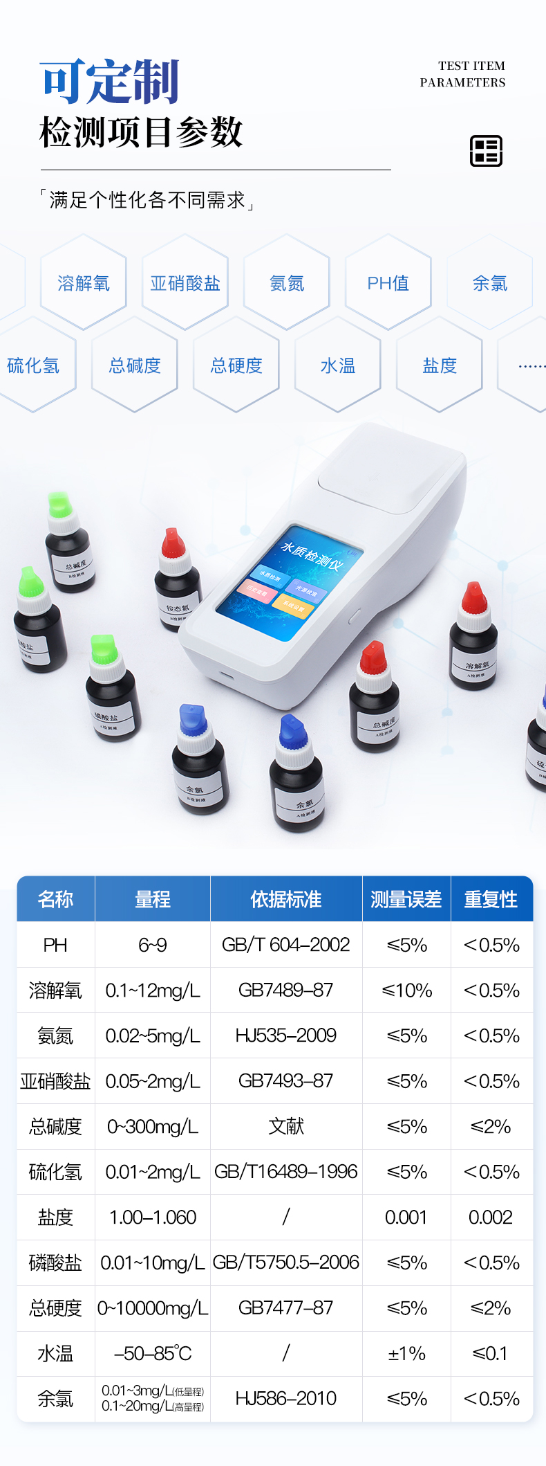 | 参数名称 | pH | 溶解氧 | 氨氮 | 亚硝酸盐 | 总碱度 | 硫化氢 | 盐度 | 磷酸盐 | 总硬度 | 水温 | 余氯 |