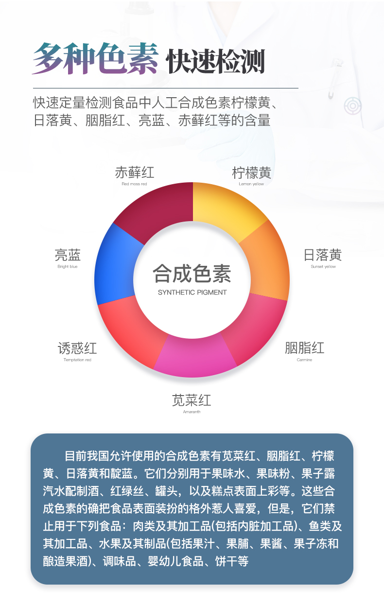 色素检测仪可快速定量检测食品中人工合成色素柠檬黄、日落黄、胭脂红、苋菜红、诱惑红、亮蓝、赤藓红的含量。目前我国允许使用的合成色素有苋菜红、胭脂红、柠檬黄、日落黄和靛蓝。它们分别用于果味水、果味粉、果子露、汽水、配制酒、红绿丝、罐头,以及糕点表面上彩等。这些合成色素的确把食品表面装扮的格外惹人喜爱,但是,它们禁止用于下列食品:肉类及其加工品(包括内脏加工品)、鱼类及其加工品、水果及其制品(包括果汁、果脯、果酱、果子冻和酿造果酒)、调味品、婴幼儿食品、饼干等。