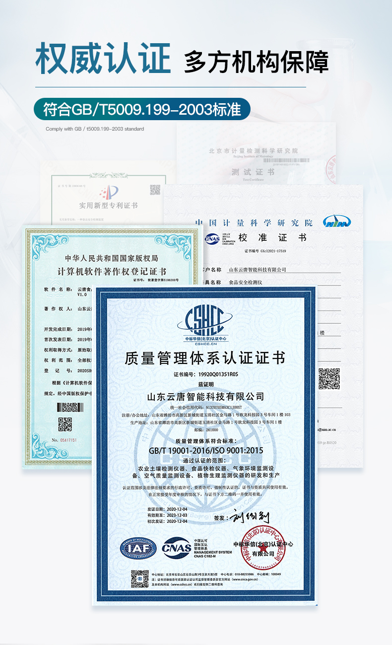 山东云唐智能科技有限公司生产的高智能食品安全检测仪为集成化食品安全快速检测分析设备,采用台式一体化设计,可快速检测200多种食品安全项目,包含非食用化学物质、滥用食品添加剂、农药残留、兽药残留、重金属、病害肉、营养强化剂、抗生素类残留、激素类残留、真菌毒素类残留、化学类残留等项目的定性定量检测。目前广泛应用于市场监管局、检测中心、卫生监督部门、农业部门、院校及各单位食堂、食品肉产品深加工企业、商超市场、司法部门、餐饮机构、养殖场、屠宰场、检验检疫部门等单位。