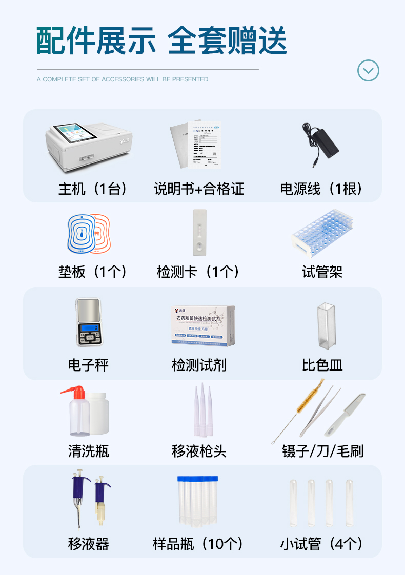 仪器采用台式一体化系统检测技术,将分光光度模块、胶体金检测模块、新型农残检测模块、数字化管理模块、无线通讯模块高度集成于一体,支持检测200种食品安全检测项目,同时预留升级检测方法。仪器检测模块标准化、智能化,可随意自由组合。检测箱体内置多个标准检测单元,检测模块可以调整配置。 仪器采用全新安卓智能系统,主控芯片采用 ARM Cortex-A7,RK3288/4核处理器,10.1寸高清液晶触摸竖屏,更加**的UI交互界面,运转快捷;仪器配备无线通信模块: 4G(APN)通讯模块、Wifi模块,蓝牙传输,同时具有双USB接口以及RJ45接口能以多种方式实现数据保存和数据传输功能。创新检测模式★检测通道:≥12通道;采用精密旋转比色池设计,使用同芯片同光源校准精度,解决不同光源之间的误差值。1-12通道间误差0.1%。(***:ZL202022821055.2) ★仪器具有自动识别比色皿检测功能,即:将样品比色皿放入仪器后,点击样品检测,仪器自动识别比色皿进行通道检测。进口高精光源:高精度进口四波长冷光源,通道配置 410、520、590、630nm 波长光源,一个光源芯片驱动一个光源,误差极小,每台设备单独**校准光源,**比对,同时参照四种不同波段光源全方位覆盖市面上99%的农残食品项目检测。胶体金模块检测方式:★采用COMS实时成像技术,可采集多个画面,支持2个金标同时读卡,通过不同颜色的灰度变化,一秒精准得出结果。智能操作分析系统:★便捷操作系统:设备检测时可在同一检测界面自动对应相关检测通道一次性选择1-12个样品名称,无须退出界面,节省操作时间。(需提供对应证明) ★数据集成系统:设备首页自动统计检测数据包含:周检测数据、月检测数据,全部检测总数量,均包含检测总数,合格数,不合格数,以及相关柱形分析图,对各项检测数据清晰掌握,无需电脑查询,更加快捷直观。(需提供对应证明文件)★项目预设系统:支持添加单个及多个相同或不相同的任务预设,一键快速调取,每一个任务分别可以设置不同的样品、批次、编号、来源、备注、抽样信息、检测信息、受检信息、复核信息等更多信息。无缝链接平台和APP实时查看下发任务。(需提供对应证明文件)★数据监管系统:同步对接监管平台,数据可局域网和互联网数据上传,检测结果可选择直接传至食品安全监管平台。集成OSS输出存储服务、区分设备定向管理应用,进行区域食品安全监管及大数据分析处理与数据统计,检测区域食品安全长短期动态,达到食品安全问题预估、预警。(需提供对应食品理化分析系统计算机软件著作权)。★ 自定义打印系统:内置全新打印系统,新创自定义打印方式,可按需灵活设置开启或关闭:产品合格证(国家农业部标准要求),二维码,抽样信息、检测信息,受检信息、复核信息、抽样日期、检测日期等信息的打印。(需提供对应证明)★系统远程更新功能:可定向分客户分仪器更新系统,按照不同客户后期实际需求添加项目,无需机器返厂,即可远程实时升级全新系统,节省时间成本及避免运输造成设备损坏。仪器主机采用一体化防水、抗压、防撞击、防腐蚀箱体设计,同时配备交直流供电,可连接车载电源,可选配大容量充电锂电池,满足现场野外检测需求。安全证书,放心保障:仪器具有中国计量科学研究院校准证书,权威认证。