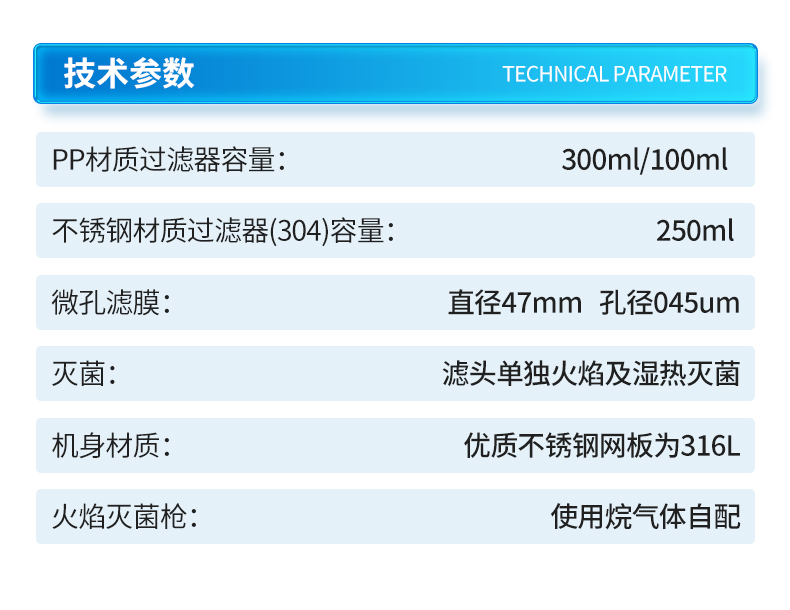 | 1、基本部件组成 | F250过滤杯、阀门、不锈钢底座、排液接口、真空泵 | 2、技术参数 | PP材质过滤器容量:300ml/100ml | 不锈钢材质过滤器(304)容量:250ml | 微孔滤膜:直径47mm孔径045um | 灭菌:滤头单独火焰及湿热灭菌 | 机身材质:优质不锈钢网板为316L | 2、技术参数 | PP材质过滤器容量:300ml/100ml | 不锈钢材质过滤器(304)容量:250ml | 微孔滤膜:直径47mm孔径045um | 灭菌:滤头单独火焰及湿热灭菌 | 机身材质:优质不锈钢网板为316L | 火焰灭菌枪:使用烷气体自配 | 3、组装 | 取不锈钢底座放置过滤网版,取橡胶管,一端与主机排液接口连接,另一端与装废液装置相连接。如此并组装完成了一个完整的微生物过滤系统。 | 4、使用 | 在超净工作台或其它符合要求的洁净环境下组装上述系统。使用前优先检查不锈钢底座与抽排废液主机连接是否完好。用火焰喷枪将不锈钢过滤网板消毒,关闭截流阀,将滤膜平铺在不锈钢过滤网板上,扣上滤杯,倒入待过滤液体,启动抽排废液主机电源,打开截流阀,滤杯里的样品就会顺机身排液出口直接流出,使样品中的微生物与样品分离,微生物被截留在滤膜上。过滤完成后拿掉滤杯转移微孔滤膜于特定的条件下培养。 | 用无菌镊子小心取出滤膜并将其正面(过滤面)平贴于培养基表面。 | 5、清洗 | 过滤完成后需及时对滤杯进行清洗,可用含中性洗涤剂的水浸泡,然后用软布类材料进行擦洗(不可用钢丝球或其它可能划伤塑料杯的器材),冲洗干净,自然晾干。若过滤的介质含阳性对照菌,需将过滤器湿热消毒处理后再进行清洗。 | 6、注意事项 | 6.1.在过滤介质前,应检查滤杯上不锈钢底座的固定圈是否松动,若松动,需旋紧。 | 6.2.透明杯体适用的消毒温度为不超过 130℃,否则易引起其变形与损坏。经反复高温高压消毒及清洗后,透明度可能下降,若影响实验操作时,建议更换新的杯体。 | 6.3.任何机械撞击(跌落、碰撞)及不当使用等都可能引起产品的损伤,建议使用中小心操作,遵循说明书各项之条款 | 6.4. 该装置不适用过滤以下介质: | a)强酸; | b)强碱; | c)强氧化剂; | d)与杯体等材料化学性能不相容的其它各类有机溶剂。 | 7. 若使用该过滤器进行除菌试验,需配置专用的回收导管。 | 8. 严禁将整机进行高压蒸汽消毒 |