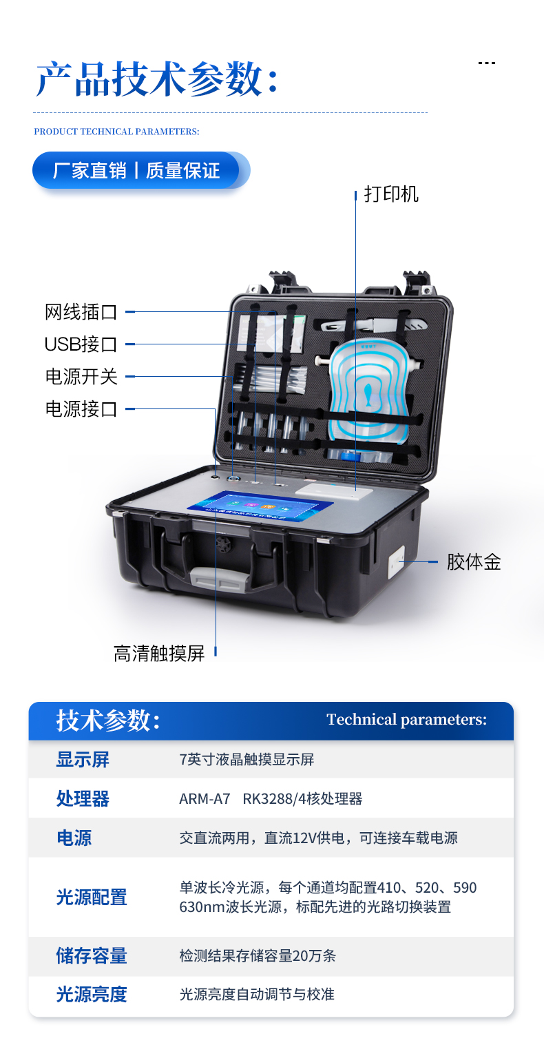 | 用途:可用于粮食谷物及其制品、饲料、植物油中真菌毒素快速定量测定; | 检测方法:采用发光定量免疫层析技术,激光激发,扫描方式收集发光荧光信号。 | 定量参数设定:RFID芯片记录检测目标的标准曲线,根据不同样本类型配备多参数卡; | 识别功能:试剂插卡后仪器自动识别检测项目; | 灵敏性和特异性:不受外界的背景干扰, 检测限为0.4-4500ug/kg;对其它毒素无非特异反应; | 稳定性:无淬灭和光漂白现象; | 检测时间快,实时显示检测曲线 | 无需孵育器,室温(15-30℃)下进行测试 | 数据获取和处理:检测结果自动获取(无需目测),可实时打印检测报告;数据可储存,可导出。 | 仪器可靠:有开机系统自检功能;仪器配有质控卡,确保检测系统自身的准确性; | 检测数据精准可靠:HPLC/LC-MS结果接近 | 检测仪器获得国家认证 | 联网:网络接口 | 升级:可以通过U盘进行软件升级 | 存储空间:≥32G,**扩展至64G | 工作功率:40W | 操作系统:windows 7 | 显示屏:可触摸显示屏,屏幕尺寸≥8寸 | 定量检测项目:包括黄曲霉毒素B1、呕吐毒素、玉米赤霉烯酮、T-2毒素、伏马毒素 |