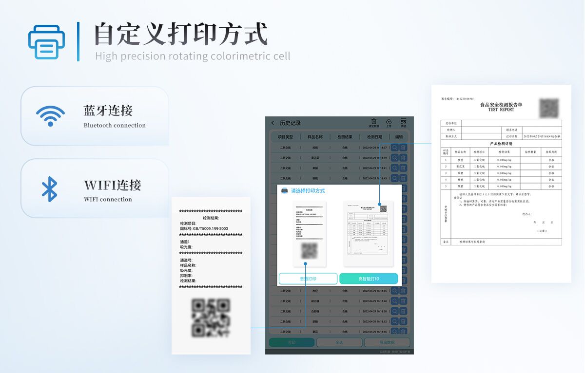 | 仪器采用台式一体化系统检测技术,将分光光度模块、新型农残检测模块、数字化管理模块、无线通讯模块高度集成于一体,支持检测200种食品安全检测项目,同时预留升级检测方法。 | 仪器检测模块标准化、智能化,可随意自由组合。检测箱体内置多个标准检测单元,检测模块可以调整配置。 | 仪器采用全新安卓智能系统,主控芯片采用 ARM Cortex-A7,RK3288/4核处理器,10.1寸高清液晶触摸竖屏,更加**的UI交互界面,运转快捷;仪器配备无线通信模块: 4G(APN)通讯模块、Wifi模块,蓝牙传输,同时具有双USB接口以及RJ45接口能以多种方式实现数据保存和数据传输功能。 | 创新检测模式: | ★检测通道:≥12通道;采用精密旋转比色池设计,使用同芯片同光源校准精度,解决不同光源之间的误差值。1-12通道间误差0.1%。(***:ZL202022821055.2) | ★仪器具有自动识别比色皿检测功能,即:将样品比色皿放入仪器后,点击样品检测,仪器自动识别比色皿进行通道检测。 | 进口高精光源: | 高精度进口四波长冷光源,通道配置 410、520、590、630nm 波长光源,一个光源芯片驱动一个光源,误差极小,每台设备单独**校准光源,**比对,同时参照四种不同波段光源全方位覆盖市面上99%的农残食品项目检测。 | 智能化操作系统: | 便捷操作系统:设备检测时可在同一检测界面自动对应相关检测通道一次性选择1-12个样品名称,无须退出界面,节省操作时间。 | 数据集成系统:设备首页自动统计检测数据包含:周检测数据、月检测数据,全部检测总数量,均包含检测总数,合格数,不合格数,以及相关柱形分析图,对各项检测数据清晰掌握,无需电脑查询,更加快捷直观。 | 项目预设系统:支持添加单个及多个相同或不相同的任务预设,一键快速调取,每一个任务分别可以设置不同的样品、批次、编号、来源、备注、抽样信息、检测信息、受检信息、复核信息等更多信息。无缝链接平台和APP实时查看下发任务。 | 数据监管系统:同步对接监管平台,数据可局域网和互联网数据上传,检测结果可选择直接传至食品安全监管平台。集成OSS输出存储服务、区分设备定向管理应用,进行区域食品安全监管及大数据分析处理与数据统计,检测区域食品安全长短期动态,达到食品安全问题预估、预警。 | 自定义打印系统:内置全新打印系统,新创自定义打印方式,可按需灵活设置开启或关闭:产品合格证(国家农业部标准要求),二维码,抽样信息、检测信息,受检信息、复核信息、抽样日期、检测日期等信息的打印。 | 系统远程更新功能:可定向分客户分仪器更新系统,按照不同客户后期实际需求添加项目,无需机器返厂,即可远程实时升级全新系统,节省时间成本及避免运输造成设备损坏。 | 仪器主机采用一体化防水、抗压、防撞击、防腐蚀箱体设计,同时配备交直流供电,可连接车载电源,可选配大容量充电锂电池,满足现场野外检测需求。 | 安全证书,放心保障:仪器具有中国计量科学研究院校准证书,权威认证。 |