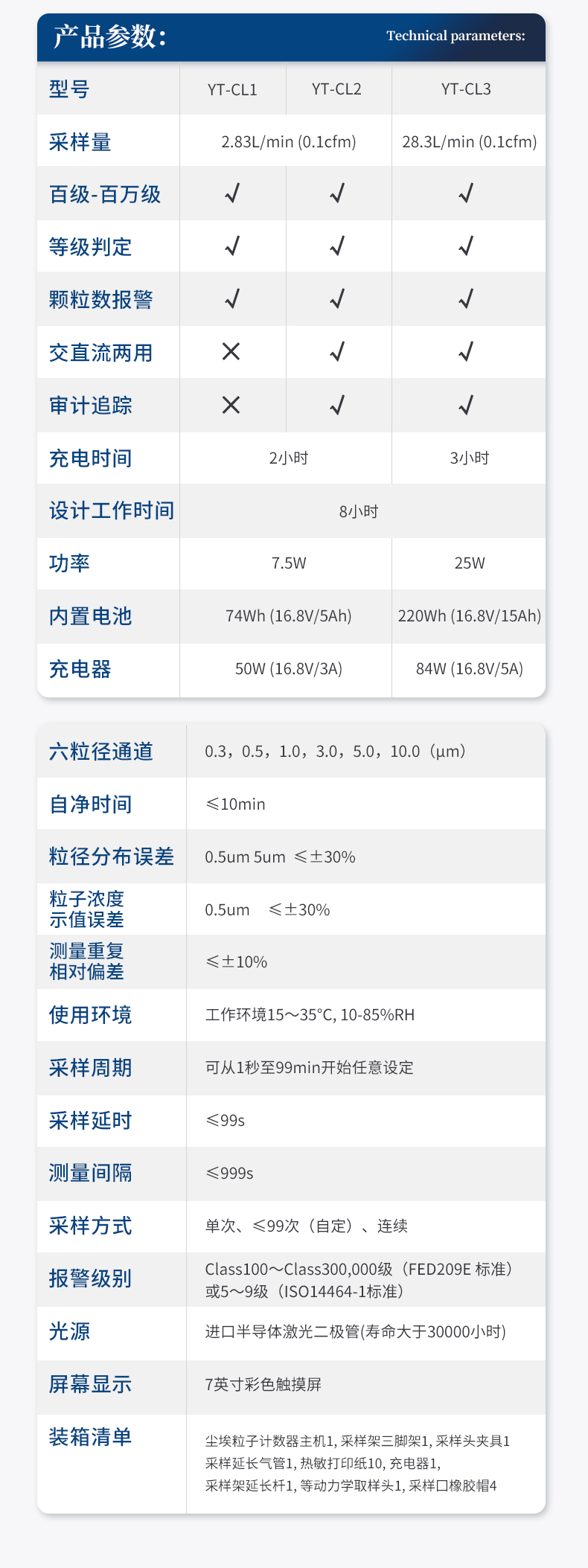 采样量:2.83L/min (0.1cfm) 六粒径通道:0.3,0.5,1.0,3.0,5.0,10.0(μm) 自净时间:≤10min 粒径分布误差:0.5um 5um ≤±30% 粒子浓度示值误差:0.5um ≤±30% 测量重复相对偏差:≤±10% 使用环境:工作环境15~35℃, 10-85%RH 采样周期:可从1秒至30000秒开始任意设定 采样延时:≤60s 测量间隔:≤60s 采样方式:单次、≤99次(自定)、连续 报警功能:通过设置报警参数实现颗粒数报警 光源:进口半导体激光二极管(寿命大于30000小时) 屏幕显示方式:7寸彩色触摸屏 数据内存容量:1--10万条,可查询,可导出。 充电时间:2小时 设计工作时间:8小时 平均功率:7.5W 内置电池:74Wh(16.8V/5Ah) 充电器:50W(16.8V/3A)