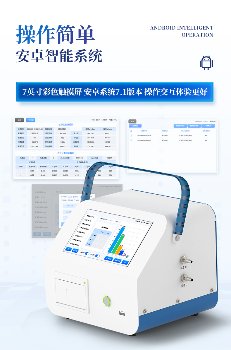 1、安卓系统7.1版本,操作交互体验更好。 2、内置温湿度传感器、环境气压传感器 3、核心部件光散射传感器明显消除腔体的杂散光,信噪比大为提高。从而使测量更准确更可靠。 4、按95%置信度(UCL)计算,计数结果可换算成m3和ft3 5、依照净化级别划分和规定,自动判定净化级别,使用便利。 6、带审计追踪功能,可查询、可追溯、可控制,符合FDA 21CFR PART11规范 7、支持wifi、蓝牙传输,数据可无线上传;同时支持U盘拷贝数据,免驱动插拔。 8、配置监管平台,检测结果可直接无线传至平台,进行洁净度长短期分析,辅助管理。 9、内置新一代高速热敏打印机,可选择所需要打印的粒径通道,灵活打印结果。 10、交直流两用,内置充电锂电池,环保耐用可支持连续采样6小时以上。 11、便捷简易伸缩式云台支架,安装采样操作更加方便。