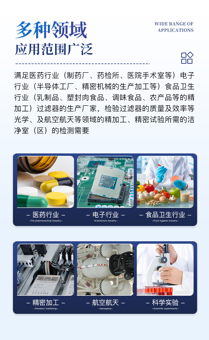 满足医药行业(制药厂、药检所、医院手术室等);电子行业(半导体工厂、精密机械的生产加工等);食品卫生行业(乳制品、塑封肉食品、调味食品、农产品等的精加工);过滤器的生产厂家,检验过滤器的质量及效率等;光学、及航空航天等领域的精加工、精密试验所需的洁净室(区)的检测需要。