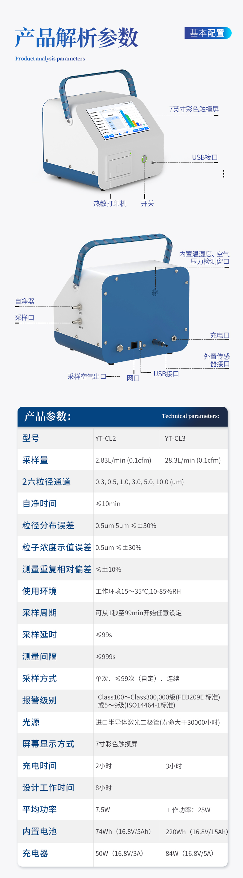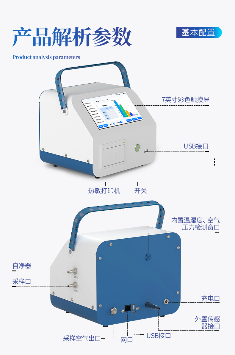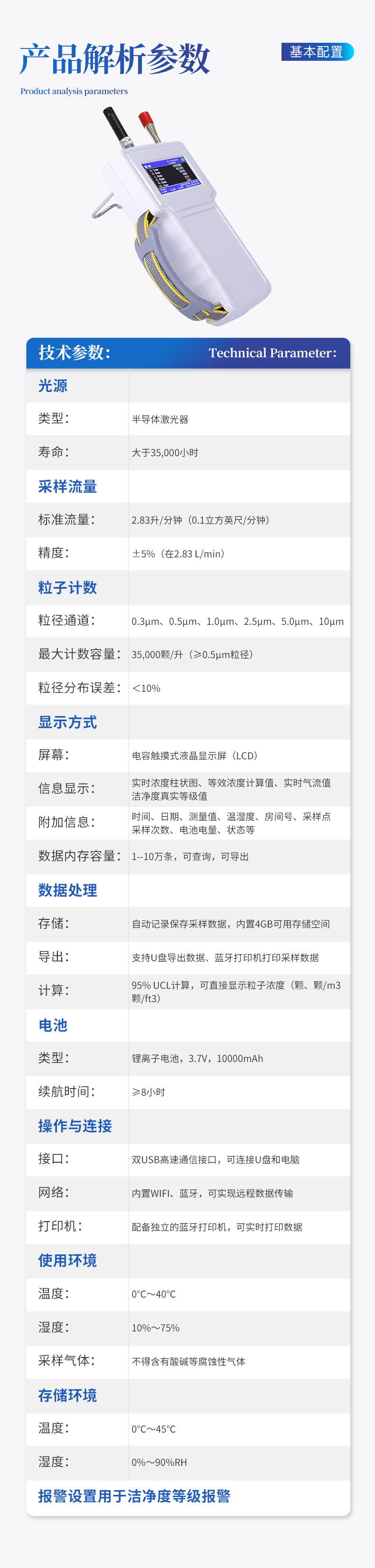 采样量:2.83L/min (0.1cfm) 六粒径通道:0.3,0.5,1.0,3.0,5.0,10.0(μm) 自净时间:≤10min 粒径分布误差:0.5um 5um ≤±30% 粒子浓度示值误差:0.5um ≤±30% 测量重复相对偏差:≤±10% 使用环境:工作环境15~35℃, 10-85%RH 采样周期:可从1秒至30000秒开始任意设定 采样延时:≤60s 测量间隔:≤60s 采样方式:单次、≤99次(自定)、连续 报警功能:通过设置报警参数实现颗粒数报警 光源:进口半导体激光二极管(寿命大于30000小时) 屏幕显示方式:7寸彩色触摸屏 数据内存容量:1--10万条,可查询,可导出。 充电时间:3小时 设计工作时间:8小时 工作功率:25W 内置电池:220Wh(16.8V/15Ah) 充电器:84W(16.8V/5A)