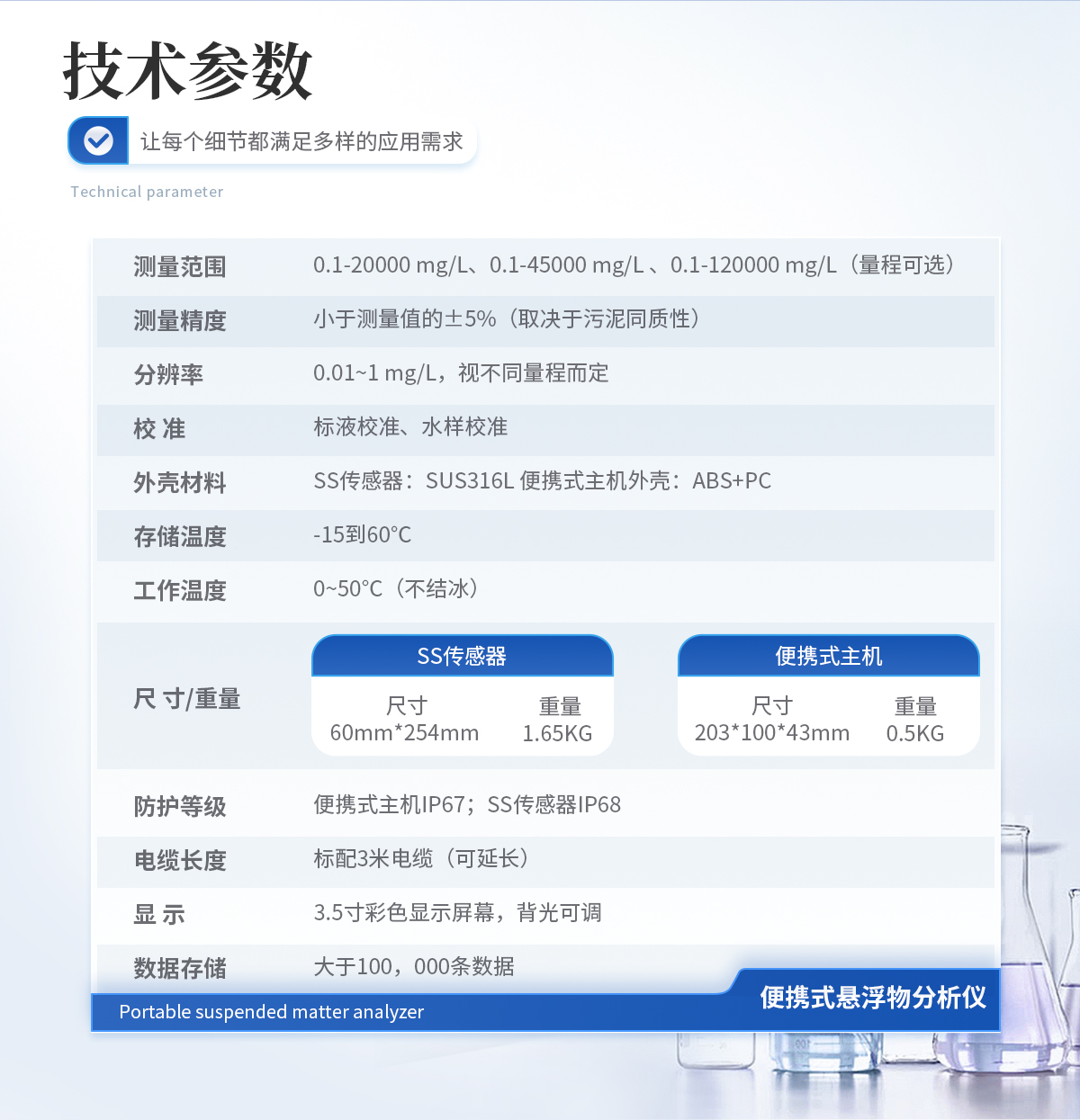 测量范围:0.1-20000 mg/L、0.1-45000 mg/L 、0.1-120000 mg/L(量程可选) 测量精度:小于测量值的±5%(取决于污泥同质性) 分辨率:0.01~1 mg/L,视不同量程而定 校 准:标液校准、水样校准 外壳材料:SS传感器:SUS316L 便携式主机外壳:ABS+PC 存储温度:-15到60℃ 工作温度:0~50℃(不结冰) 尺 寸/重量:SS传感器尺寸:直径60mm*长度 254mm 重量:1.65KG 便携式主机尺寸:203*100*43mm,重量:0.5KG 防护等级:便携式主机IP67;SS传感器IP68 电缆长度:标配3米电缆(可延长) 显 示:3.5寸彩色显示屏幕,背光可调 数据存储:大于100,000条数据