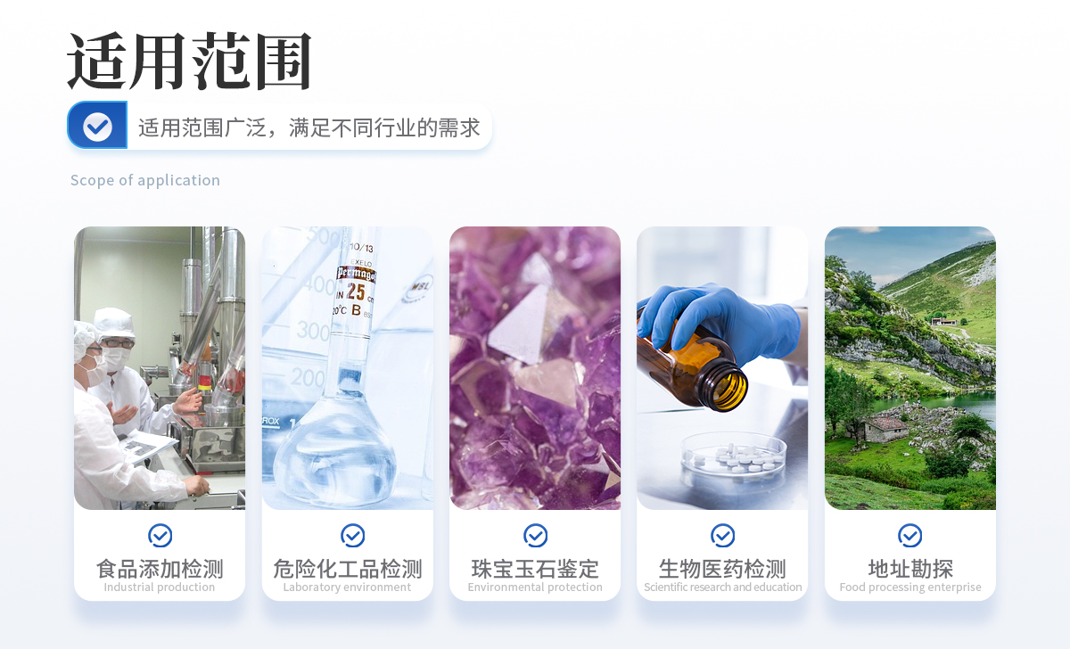 食品违禁添加物、色素添加、农兽药残留检测 爆炸物、危险化工品、易燃易爆品检测 珠宝玉石鉴定、文物鉴别 生物医药检测、材料表征、地址勘探等 其他各类订制应用