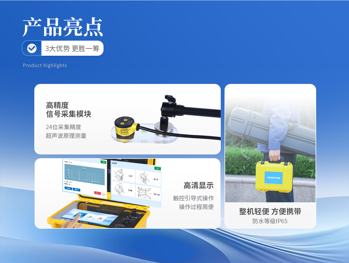 适应于四种基本堰型:三角堰、 矩形堰、 等宽堰、 巴歇尔槽 高精度信号采集模块,24 位采集精度,测量数据真实有效 大屏幕彩色液晶触摸屏,触控引导式操作,操作过程简便 曲线显示流量变化趋势及液位变化趋势 友好的人机交互界面,图文结合,即可对仪器进行操作 仪器带有微型打印机,可现场直接打印测量数据 可与电脑连接,将测量数据输出至电脑,便于用户对数据进行统计分析 可存储 50000 次的测量历史记录 内含大容量锂电池,一次充电可连续测量 72 小时 流量计内置智能化电源管理系统,延长电池使用寿命 开机密码进入,有效保护测量比对数据及结果 手提箱式设计,整机重量轻,方便用户携带 具有USB数据导出和打印机数据打印功能 可选配GRS或北头定位功能