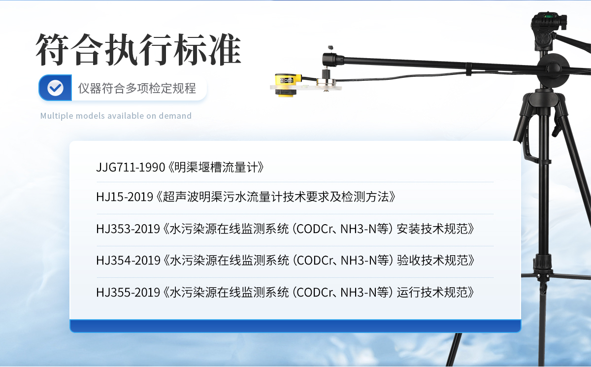 JJG 711-1990 《明渠堰槽流量计》 ZJJ-LR-01-2022《超声波明渠流量计试行检定规程》 HJ 15-2019 《超声波明渠污水流量计技术要求及检测方法》 HJ 353-2019 《水污染源在线监测系统(CODCr、NH3-N等)安装技术规范》 HJ 354-2019 《水污染源在线监测系统(CODCr、NH3-N 等)验收技术规范》 HJ 355-2019 《水污染源在线监测系统(CODCr、NH3-N等)运行技术规范》