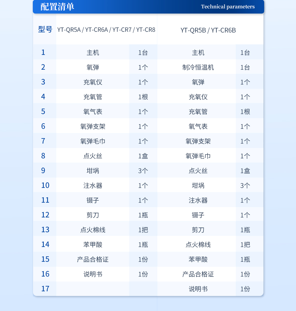 | 主机 1台 | 制冷恒温机 1台 | 氧弹 1个 | 充氧仪 1个 | 充氧管 1根 | 氧气表 1个 | 氧弹支架 1个 | 氧弹毛巾 1个 | 点火丝 1盒 | 坩埚 3个 | 注水器 1个 | 镊子 1个 | 剪刀 1瓶 | 点火棉线 1把 | 苯甲酸 1瓶 | 产品合格证 1份 | 说明书 1份 |