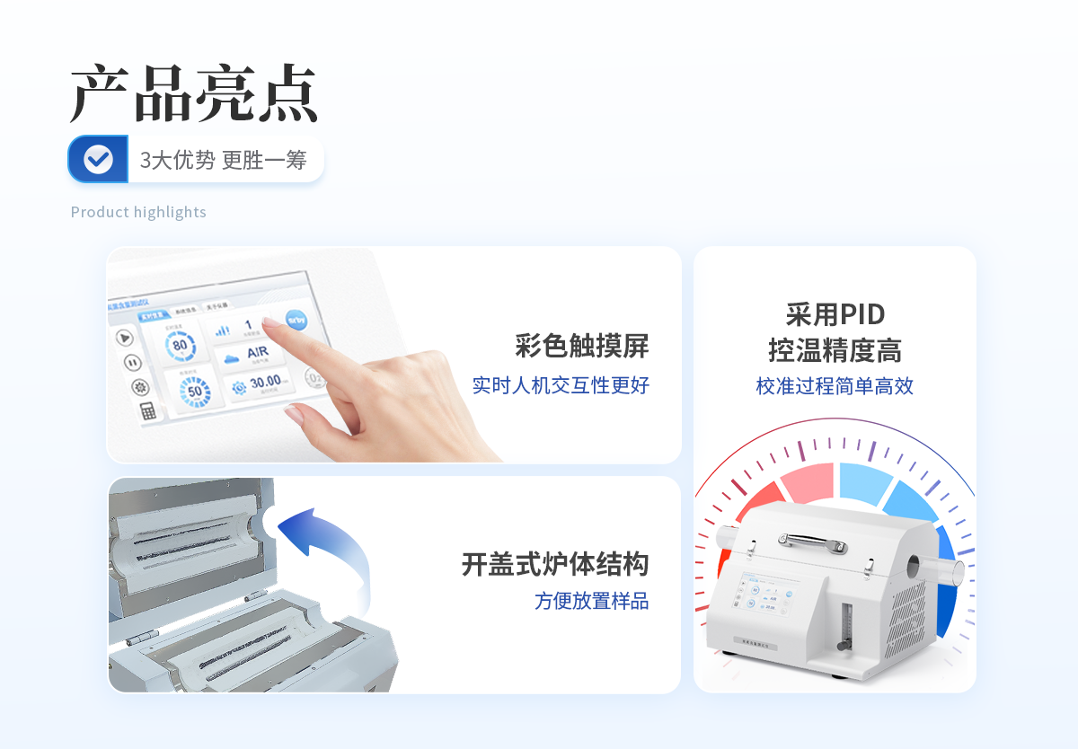 | 1. 采用开盖式炉体结构,方便放置样品且散热效果更佳。 | 2. 炉膛采用超长加热单元,可同时测试4组样品,大大提高测试效率。 | 3. 软件自带计算功能,可以一键自动计算出炭黑含量、灰分含量,非常得方便快捷。 | 4. 采用PID精准控温,控温精度高,温度范围大,炉膛温度均匀性高。 | 5. 7寸液晶触摸屏显示,可一键操作启动,设定恒温时间,恒温精度高; | 6. 智能化可编程控制,可设置多组分段升温程序。 |
