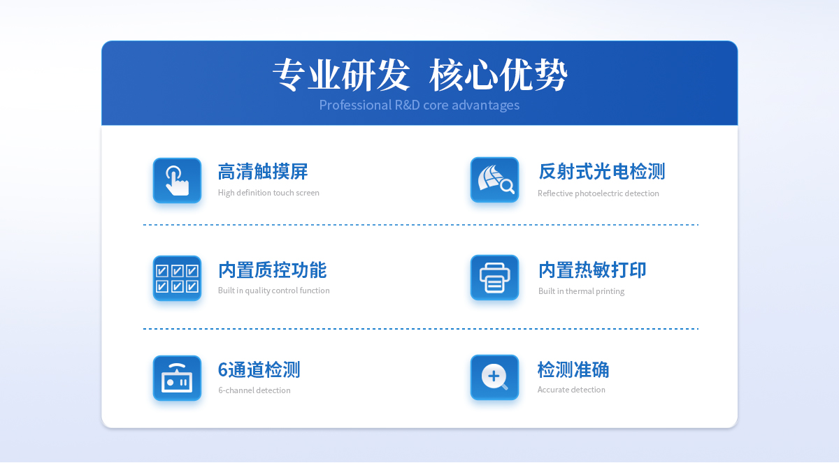 | 1、 手持式设计,电池供电,紧凑轻便,兼顾移动检测需求 | 2、 Android4.4系统,界面友好,操作简单流畅,无需外接设备; | 3、 8G超大容量内存,支持按日期灵活查询、预览、删除结果,并生成多样化专业报告。 | 4、 高精度光学系统:采用特定波长光源和光电传感器,减少环境光干扰。 | 5、 二维码扫描录入样本信息,避免人工错误 | 6、 内置热敏打印机,检测完成即可现场打印标准报告,提升工作效率。 | 7、 关键部件实时自诊断功能,保障仪器长期稳定运行。 | 8、 无线网络及蓝牙,构建完善的数据监控平台,实现数据实时上传、远程查询、统计分析和监管协同。 | 9、 通道内置孵育模块,为特定试纸条反应提供**温度环境。 | 10、 支持多种品牌/类型的金标试纸条 | 11、 内置质控功能,可设备送检、设备自检、试剂卡自检 | 12、 检测方式:孵育检测、即时检测(对检测数据复检核实) | 13、 检测曲线:可以对试剂卡的检测核验,防止误判。 | 14、 检测结果:报告出检测项目、被测物质的结果、检测单位、被检查单位、检验员、检测时间、检测限等信息可在触摸屏上显示,可通过仪器内置打印机输出 | 15、 项目管理:支持项目拓展 | 16、 界面设置:可修改标题和页尾信息,灵活展示仪器信息 |