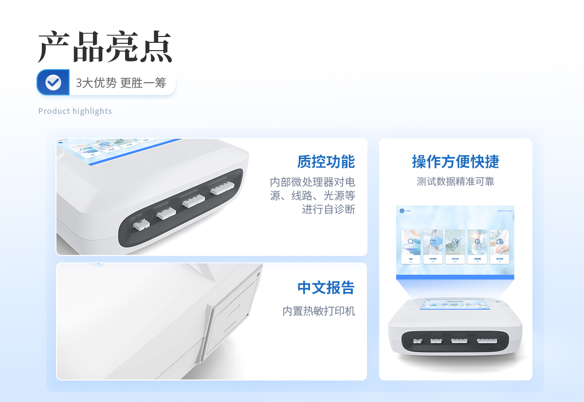 | 1、 手持式设计,电池供电,紧凑轻便,兼顾移动检测需求 | 2、 Android4.4系统,界面友好,操作简单流畅,无需外接设备; | 3、 8G超大容量内存,支持按日期灵活查询、预览、删除结果,并生成多样化专业报告。 | 4、 高精度光学系统:采用特定波长光源和光电传感器,减少环境光干扰。 | 5、 二维码扫描录入样本信息,避免人工错误 | 6、 内置热敏打印机,检测完成即可现场打印标准报告,提升工作效率。 | 7、 关键部件实时自诊断功能,保障仪器长期稳定运行。 | 8、 无线网络及蓝牙,构建完善的数据监控平台,实现数据实时上传、远程查询、统计分析和监管协同。 | 9、 通道内置孵育模块,为特定试纸条反应提供**温度环境。 | 10、 支持多种品牌/类型的金标试纸条 | 1、 插卡判断:检测卡未插入检测通道不能检测 | 11、 内置质控功能,可设备送检、设备自检、试剂卡自检 | 12、 检测方式:孵育检测、即时检测(对检测数据复检核实) | 13、 检测曲线:可以对试剂卡的检测核验,防止误判。 | 14、 检测结果:报告出检测项目、被测物质的结果、检测单位、被检查单位、检验员、检测时间、检测限等信息可在触摸屏上显示,可通过仪器内置打印机输出 | 15、 项目管理:支持项目拓展 | 16、 界面设置:可修改标题和页尾信息,灵活展示仪器信息 |