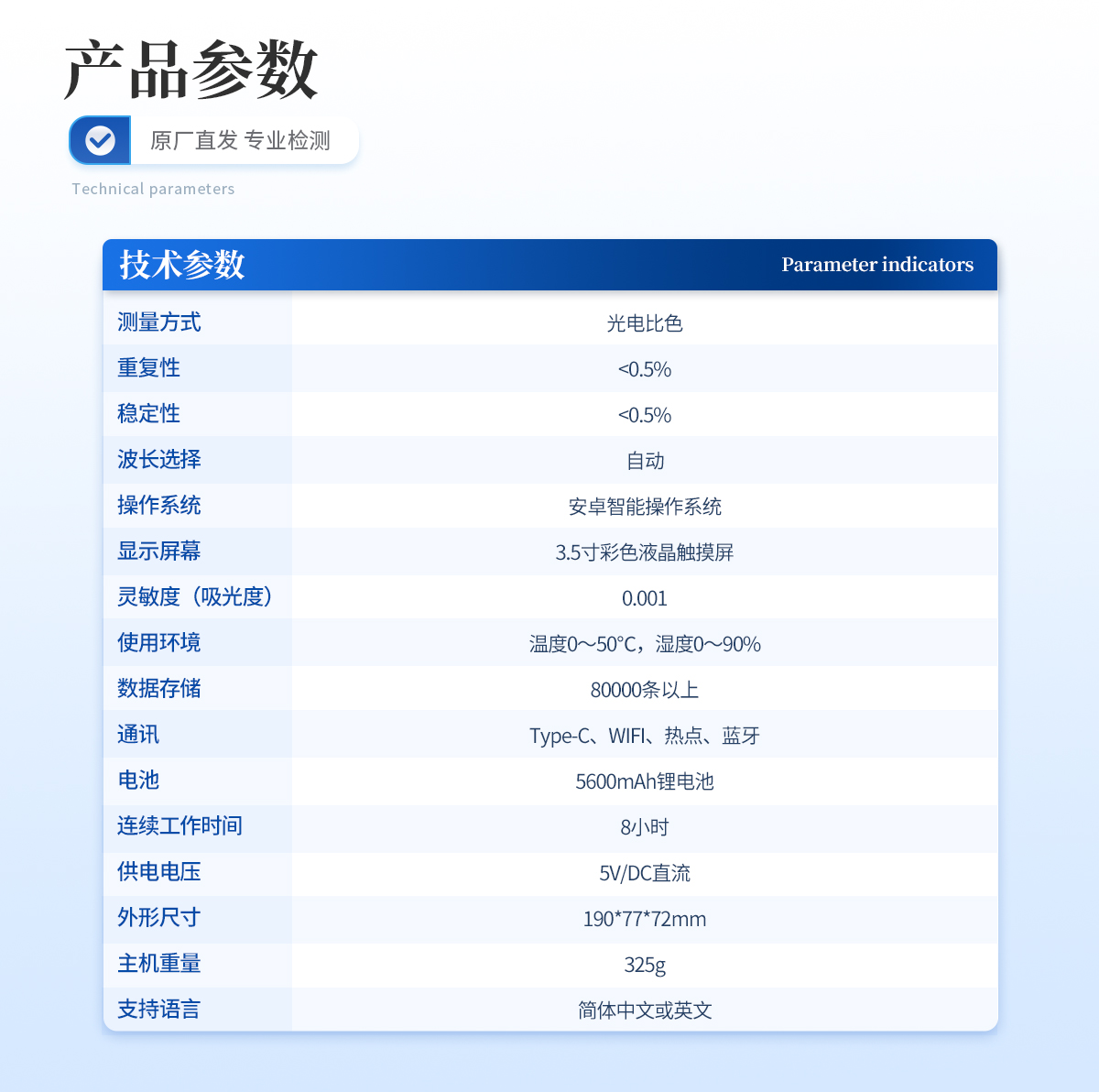 | 亚氯酸盐:0.05~2.5mg/L; | 参考方法:碘量法原理 | 测量方式:光电比色 | 重复性:<0.5%> | 稳定性:<0.5%> | 波长选择:自动 | 操作系统:安卓智能操作系统 | 显示屏幕:3.5寸彩色液晶触摸屏 | 灵敏度(吸光度):0.001 | 使用环境:温度0~50℃,湿度0~90% | 数据存储:80000条以上 | 通讯:Type-C、WIFI、热点、蓝牙 | 电池:5600mAh锂电池 | 连续工作时间:8小时 | 供电电压:5V/DC直流 | 尺寸:190mm*77mm*72mm | 主机重量:325g | 支持语言:简体中文或英文 |