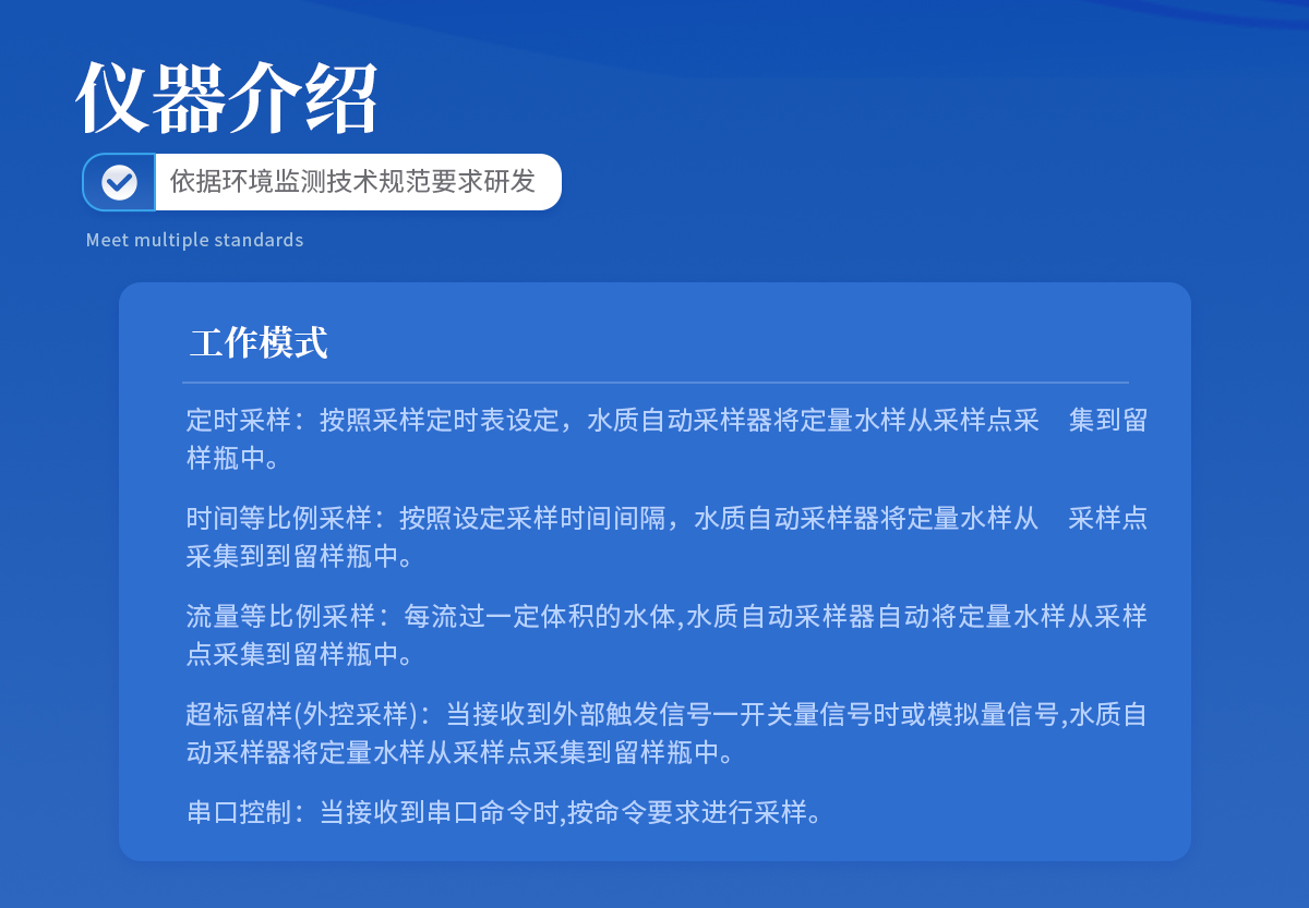 | 节能:**功率190W, 平均功率45W。 用环保的方式完成环保事业。 | 可靠:维护周期≥168h,蠕动泵管等耗品平均使用寿命三年; | 与水接触的所有容器均为模具加工的耐腐蚀材料; | 与水接触或可能会意外接触水的用电设备均为直流24V供电,更好的保护使用者; | 水样冷藏箱物理锁与密码电子锁并用,双人双锁确保水样安全; | 多种固定剂添加保障不同因子留存时间更长; | 合理的混匀桶结构,高速搅拌让水样混匀更完全,搅拌桨外四氟内304钢的结构确保不与水 样发生化学反应; | 智能:断电保护功能使采样器在因不可抗力导致采样器运行中断电,再次上电时,采样器所设定的参数不会改变,且能够恢复到断电前的工作模式继续运行; | 简单:安装简单,一人一小时既能完成一台采样器的现场安装; |