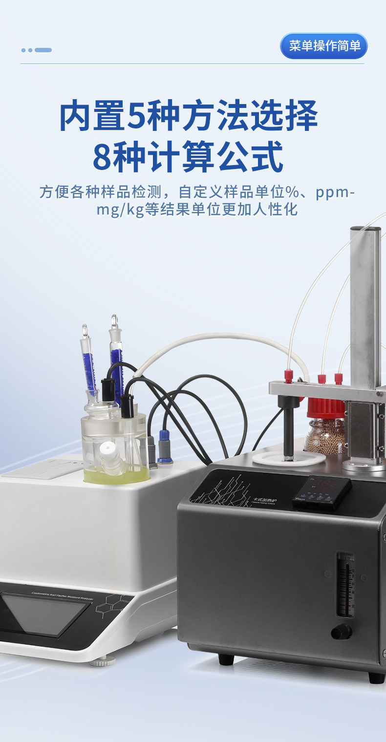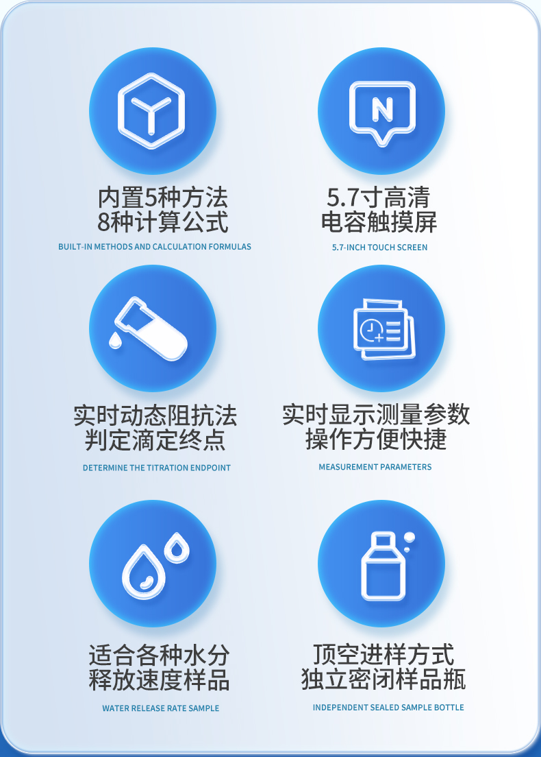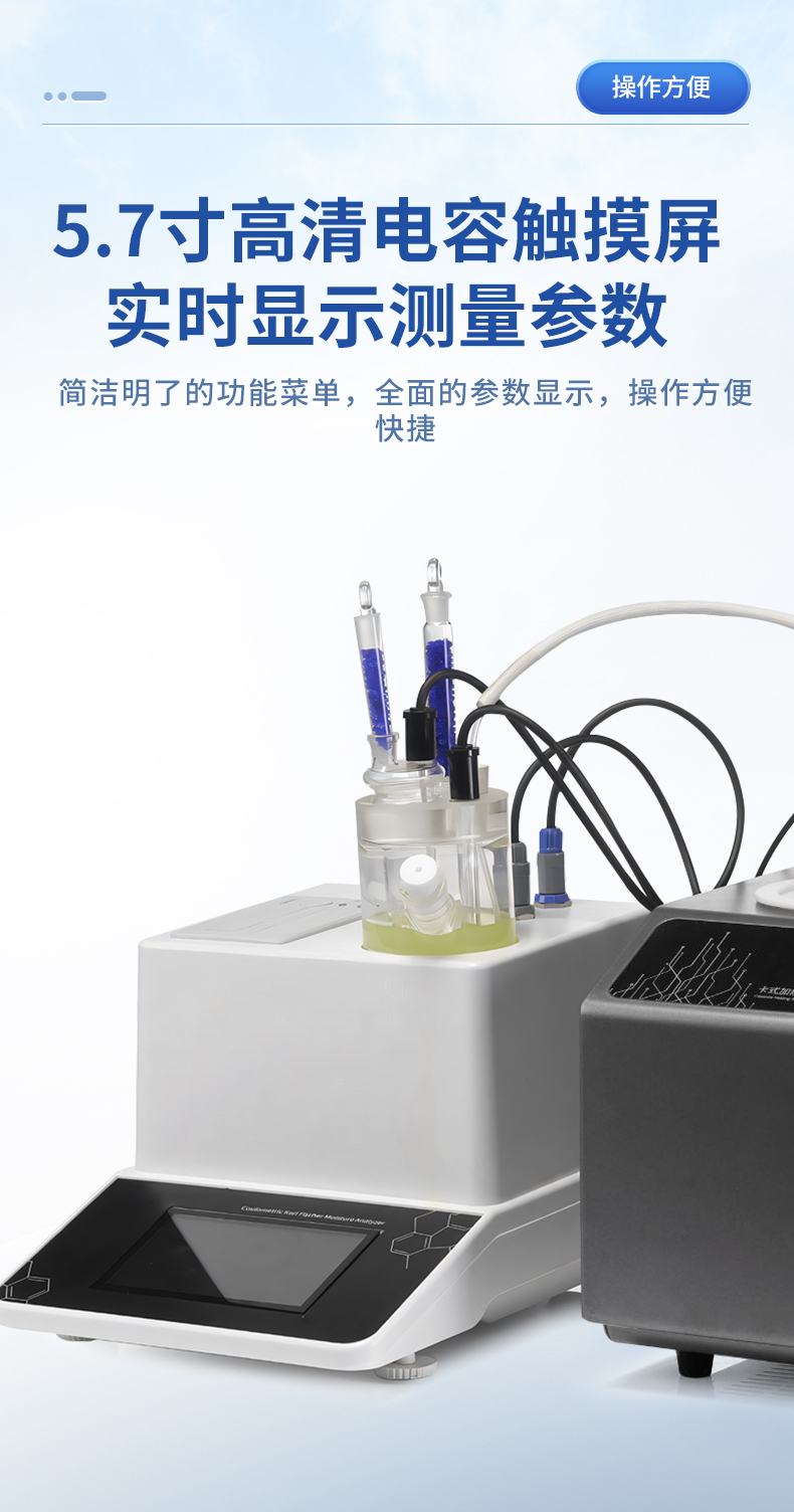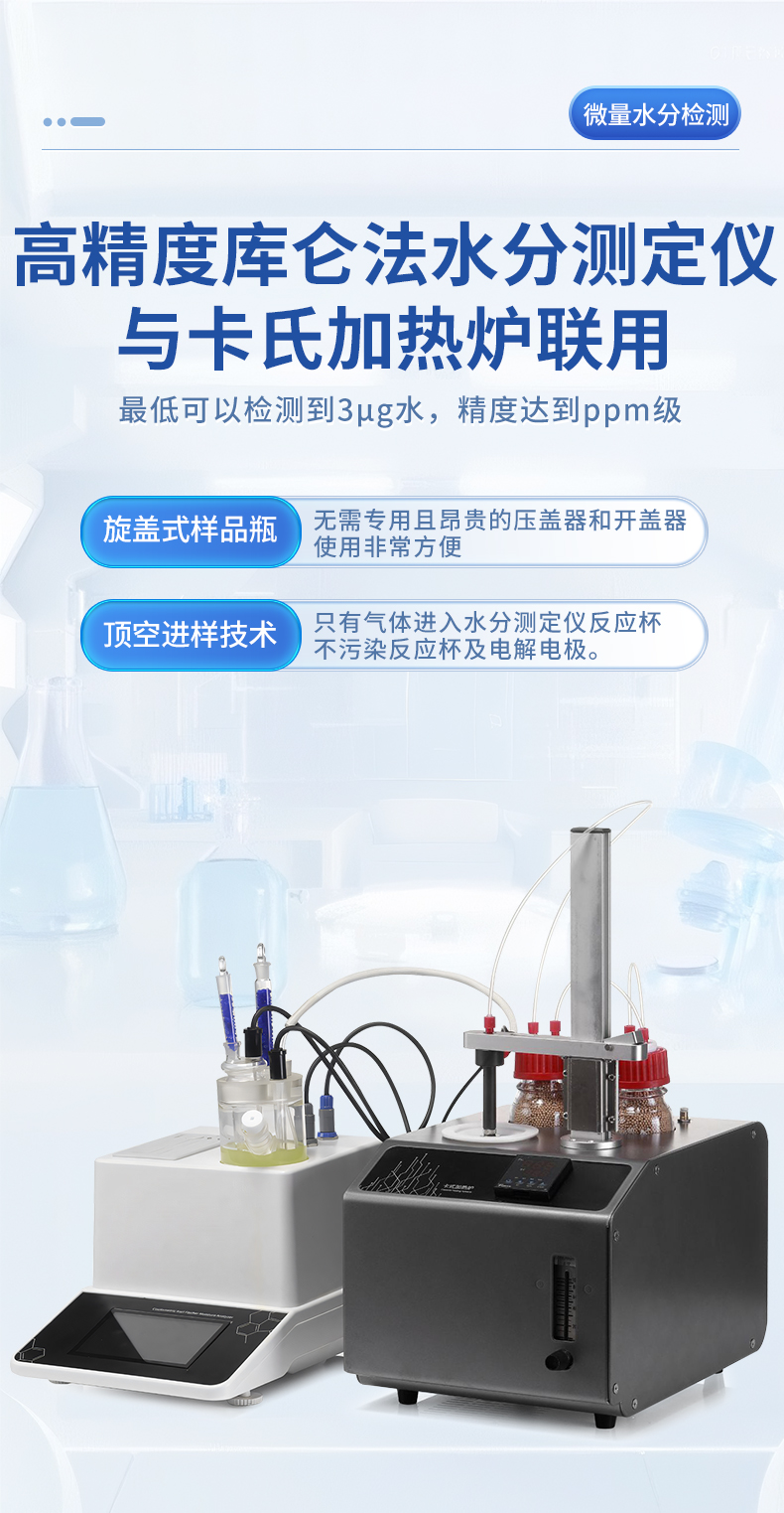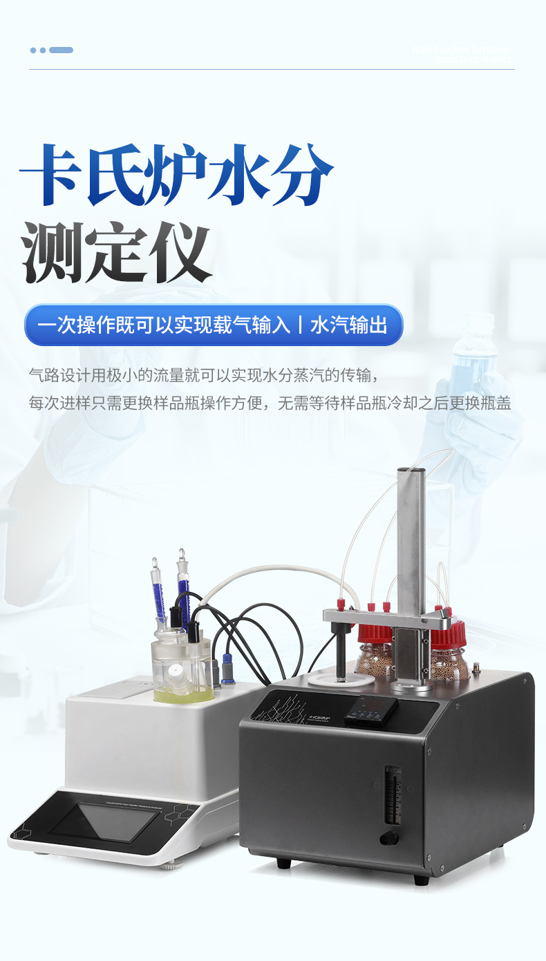 | 1. 采用高精度库仑法水分测定仪与卡氏加热炉联用,**可以检测到3μg水,精度达到ppm级; | 2. 空芯气针进样,和带加热功能的气体输送管路,零死体积水汽不凝结,操作更简单,同时也很大的提高了仪器的准确性和重复性; | 3. 5.7寸高清电容触摸屏,实时显示测量参数,简洁明了的功能菜单,全面的参数显示,操作方便快捷 ; | 4. 内置5种方法可供选择,8种计算公式方便各种样品检测,自定义样品单位%、ppm、mg/kg等结果单位更加人性化; | 5. 系统实时检测环境中的水分,精准扣除漂移,采用实时动态阻抗法判定滴定终点,测量结果更精准; | 6. **温度300℃可以满足大部分样品检测,气流0-100ml可调,适合各种水分释放速度的样品; | 7. 操作方便,用户只需要设置合适的温度,合适的流量,把样品放入事先准备好的样品瓶,放入加热器,然后把传输针扎入样品瓶的硅胶垫,在仪器上点开始测量即可; | 8. 无需等待上一次样品瓶冷却之后才能进行下一次样品测量,更换样品瓶过程中样品瓶始终保持密封状态,测量效率更高更准确,尤其是吸湿性强的样品无需担心空气中水分的干扰; | 9. 采用顶空进样的方式,保证每个测定采用“新”的样品瓶,样品测定无交叉感染。样品瓶体积小,确保较小的死体积和背景水分值。独立密闭样品瓶,测定时无需样品转移,结果更准确; | 10. 旋盖式样品瓶,无需专用且昂贵的压盖器和开盖器,使用非常方便; | 11. 顶空进样技术,只有气体进入水分测定仪反应杯,不污染反应杯及电解电极。 |