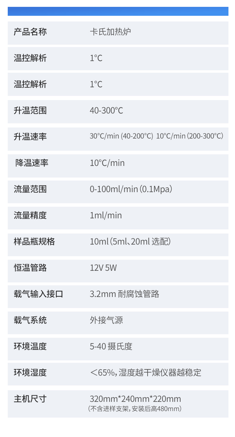 | 1. 测定原理:卡尔费休库伦法(电量法) | 2. 测量速度:2.8mgH 2 O/min(**) | 3. 测量范围:3μg-300mg(典型值) | 4. 测量准确度:3μg(10ug--100μg H2O) ≤0.3%(水含量>100μg H2O)(不含进样量误差) | 5. 测量准确度:3μg(10ug--100μg H2O) ≤0.3%(水含量>100μg H2O)(不含进样量误差) | 6. 测量分辨力:0.1μg H 2 O | 7. 相对含水量范围:1ppm-100% | 8. 电解电流:0-500mA 可调节 | 9. 水分浓度分辨率:0.001ppm | 10. 浓度单位:%、ppm、mg/kg | 11. 搅拌速度:无级触摸调节 | 12. 漂移值空白值扣除:自动扣除 | 13. 特殊功能:自动漂移补偿、环境及本底水分自动扣除、故障自检提示 | 14. 显示及操作:彩色触摸屏 | 15. 样品编号:用户可自由设定样品编号 | 16. 存储数据:500条 | 17. 打印功能:内置低能耗高速热敏打印机,58毫米纸宽 | 18. 打印内容:根据用户测量公式及测量结果显示不同内容 | 19. 日历/时间:当前时间、日期、检测时间日期显示并打印输出 | 20. 终点指示:屏幕提示 / 打印输出 / 声音警告 / 终点灯指示 | 21. 使用环境:温度 2℃-50℃,湿度‹90% | 22. 功率消耗:≤50W | 23. 主机尺寸:320*220*190mm | 24. 电源电压:220V 50HZ 150W | 25. 重量:主机净重 4kg 包装后 8KG | 26. 产品名称:卡氏加热炉 | 27. 温控解析:1℃ | 28. 温控解析:1℃ | 29. 升温范围:40-300℃ | 30. 升温速率:30℃/min (40-200℃) 10℃/min(200-300℃) | 31. 降温速率:10℃/min | 32. 流量范围:0-100ml/min(0.1Mpa) | 33. 流量精度:1ml/min | 34. 样品瓶规格:10ml(5ml、20ml 选配) | 35. 恒温管路:12V 5W | 36. 载气输入接口:3.2mm 耐腐蚀管路 | 37. 载气系统:外接气源 | 38. 环境温度:5-40 摄氏度 | 39. 环境湿度:<65%,湿度越干燥仪器越稳定 | 40. 主机尺寸:320mm*240mm*220mm(不含进样支架,安装后高480mm) |