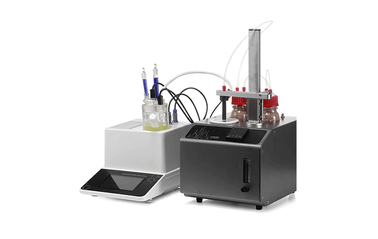 | 1. 自备天平(建议万分之一精度)、高纯氮气(99.999%)、标准氮气减压阀。 | 2. 仪器通过高纯氮气作为载体,使挥发水分进入试剂进行反应。 | 3. 连接好氮气-卡氏炉-水分仪,在卡氏炉上装入空样品瓶,通气进行平衡,扣除载气中的水分影响,调整水分仪上的进样延迟及电解时间参数。 | 4. 仪器平衡结束后,取一个新的样品瓶,去皮,装入样品,称重。 | 5. 在水分仪上输入样品重量,点击开始进样进行测试,用装有样品的样品瓶替换空样品瓶,卡氏炉加热后会使样品中的水分挥发,通过氮气将水分输送到水分仪的试剂中,水分仪识别水分参与,反应开始。 | 6. 水分仪实时显示水分含量,待仪器再次平衡后,反应结束,此时水分仪显示*终的水分含量(ug)与质量浓度单位(ppm、%、mg/kg)。 |