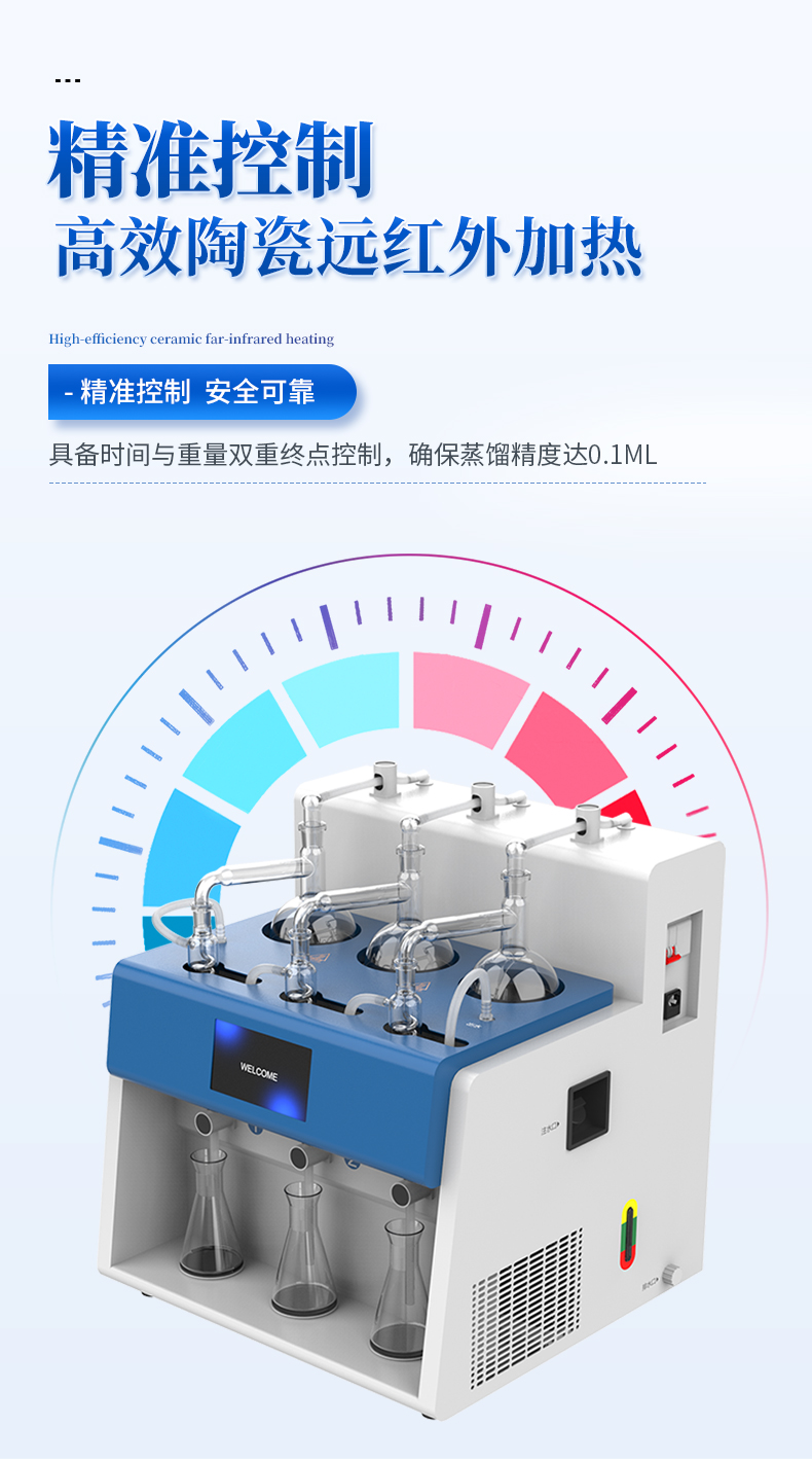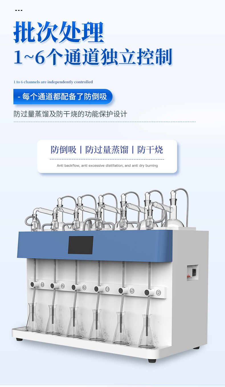 智能一体化蒸馏仪采用智能模块化设计:方法自定义设置保存/读取、开机自动调取使用,冷凝单元特殊定制蛇形冷凝管、智能终点控制防过量蒸馏、防倒吸保护,防干烧保护、实现了智能操作简单、自动蒸馏、美观实用、节能降耗、节省人工的同时为用户做样提**率节约人员成本开销。