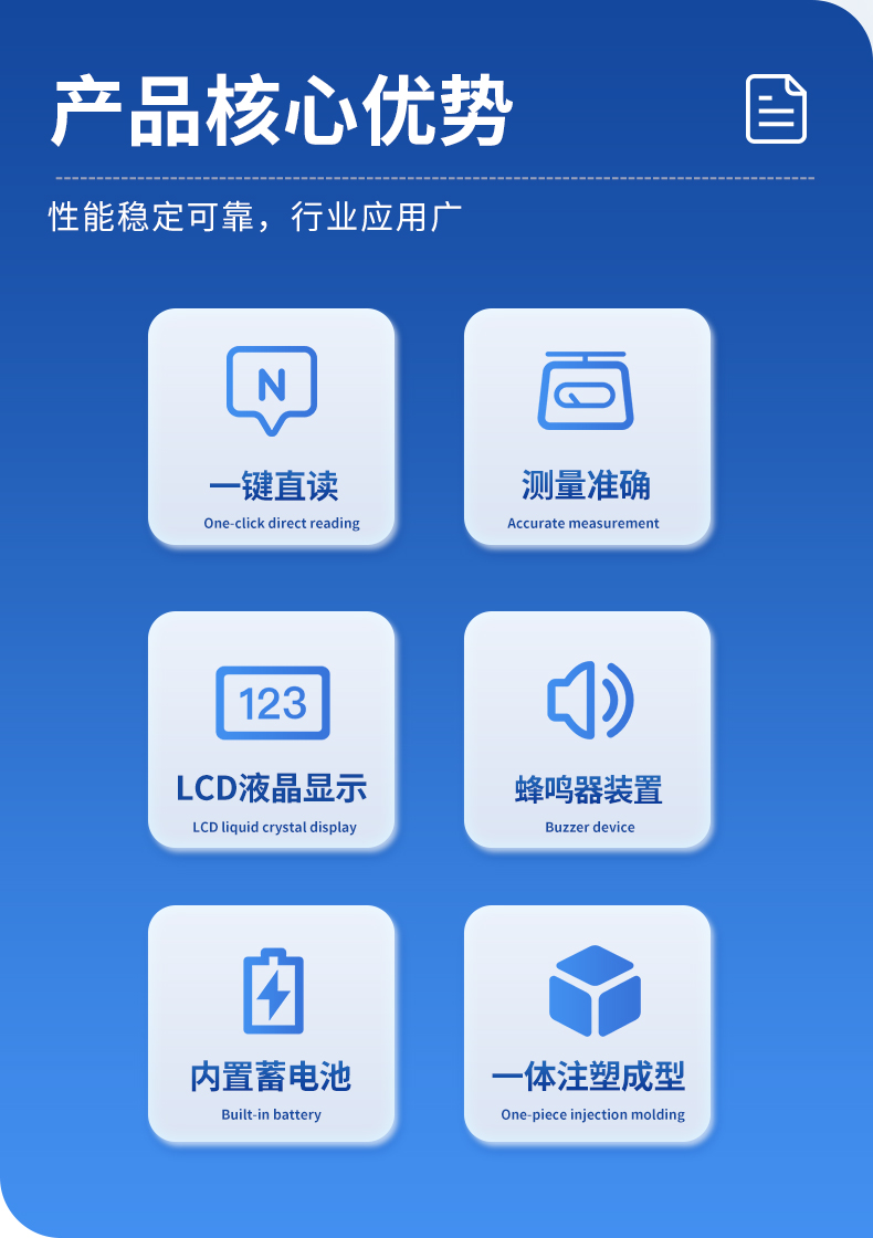 | 测试种类 化工溶液、化工助剂、现代能源、石油燃烧、药剂、油漆涂料、沥青、食用油等各种液体 | 测试时间 约5秒 | 显示值 密度、体积 | 温度补偿 溶液温度可设定至0~100℃ | 溶液补偿 溶液可设定至19.999 |