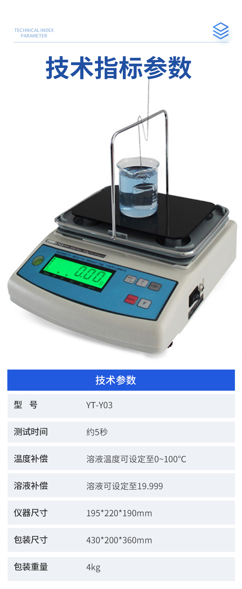 | YT-Y01 称重范围:0.01-300g 称重精度:0.01g 密度精度:0.001g/cm3 | YT-Y02 称重范围:0.01-600g 称重精度:0.01g 密度精度:0.001g/cm3 | YT-Y03 称重范围:0.005-300g 称重精度:0.005g 密度精度:0.0001g/cm3 |
