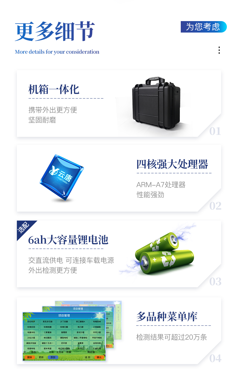 | 机箱采用工业级ABS工程塑料箱,方便携带,稳固耐用,便于流动测试。 | 智能操作系统,采用更加人性化操作,主控采用多核处理器,主频1.88Ghz,运转速度更快速,稳定性更强。 | 自动判断样品是否合格,检测结果更加直观。 | 仪器具有100多种蔬菜名称菜单库,分类管理,并可按需添加或删除蔬菜名,编辑蔬菜名称,可直接打印出蔬菜名称。 | 检测通道:6个检测通道,可以同时测试多个样品,循环检测,即放即检,每个样品由程序控制分别独立工作,不会互相干扰。 | 仪器具有wifi联网功能,可将数据快速上传电脑,进行数据管理与统计,4G信号GPRS远传功能,可插手机卡实现数据远传平台,。 | 显示方式:7英寸高灵敏真彩触摸屏显示,人性化中文操作界面,读数直观、简单。 | 打印机采用串口5v打印,可选择手动打印或者自动打印,三分钟出打印结果,打印格式为检测人姓名、吸光度差值、检测时间、检测机构、样品名称及结果判定。 | 光源采用进口超高亮发光二极管,具有低功耗、高精度、稳定性强、光源可控可以关掉不使用的光源,响应速度快等优点。 | 智能恒流稳压,光强自动校准,长时间连续工作光源无温漂现象。 | 采用USB2.0接口设计,方便数据的存贮和移动,并可随时与计算机直接相连,并且可用计算机控制仪器。实现数据查询、浏览、分析、统计、打印等。 | 智能化程度高,仪器具有自检功能:具有开机自检和调零功能,具有自动检测重复性功能 | 仪器具有自身保护功能,可设置用户名及密码,防止非工作人员操作等。 | 采用DC12v直流供电,安全系统更高,并且配备6A锂电池充电器。 | 仪器具有重新校准、锁定、恢复出厂设置功能。 |