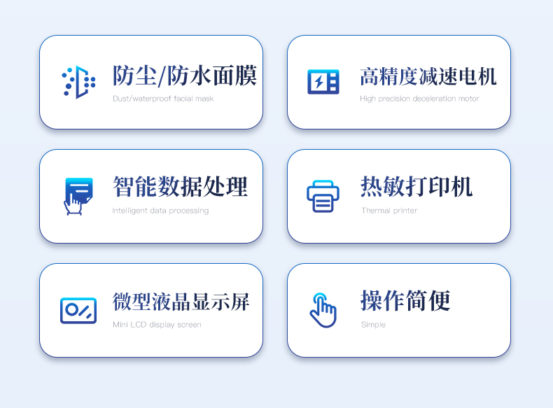 | 防尘、防水面膜、薄膜按键和微型液晶显示屏 | 高精度减速电机及调速器组成的振动部分 | CPU 智能数据处理部分 | 高分辨率热敏打印机 | 测量结果**小数后4 位 | 仪器结构牢固,外型美观,操作简便 |