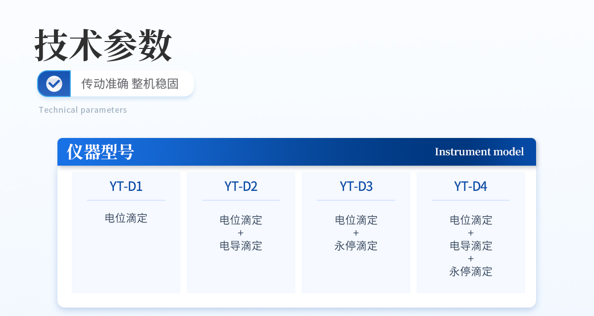 | 滴定分析重复性:≤0.2% | 滴定分析误差:≤1.5% | 10mL滴定管滴定容量精度:±5μL | 20mL滴定管滴定容量精度:±10μL | 10mL滴定管滴定容量误差:10μL/10mL | 20mL滴定管滴定容量误差:20μL/10mL | 电位范围:-2000—2000mV | 电位分辨率:0.1mV | 电位基本误差mV:±0.25‰/FS | 电位稳定性mV:±0.3mV/3h | 永停极化电压:30mV、50mV、100mV | 永停电流范围:0.00uA-200uA | 永停电压误差:±1mV | 永停电流误差:±1.0% FS | pH范围:0-14PH | pH分辨率:0.01PH | pH基本误差:±0.01PH | 温度测量范围:-5 - 105℃ | 温度分辨率:0.1℃ | 温度基本误差:0.2℃ |